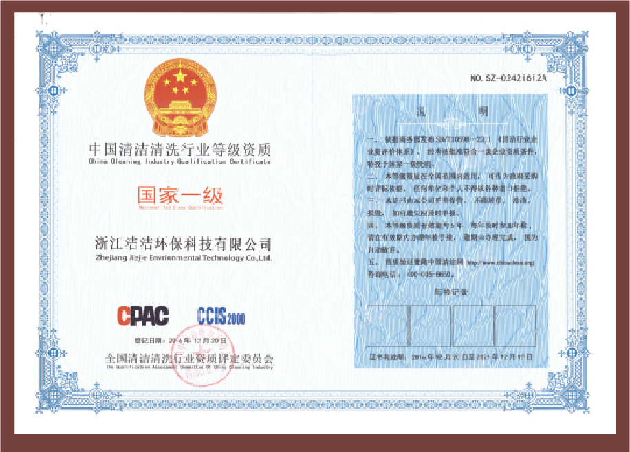 重要榮譽:“全國信用等級AAA級企業”、全國“重質量、守信 用企業”、“浙江省質量服務誠信AAA級企業”、中國中小商業 企業協會清潔行業分會常務理事員會單位